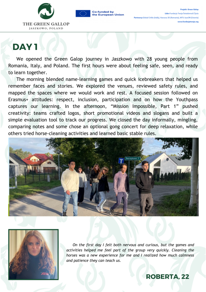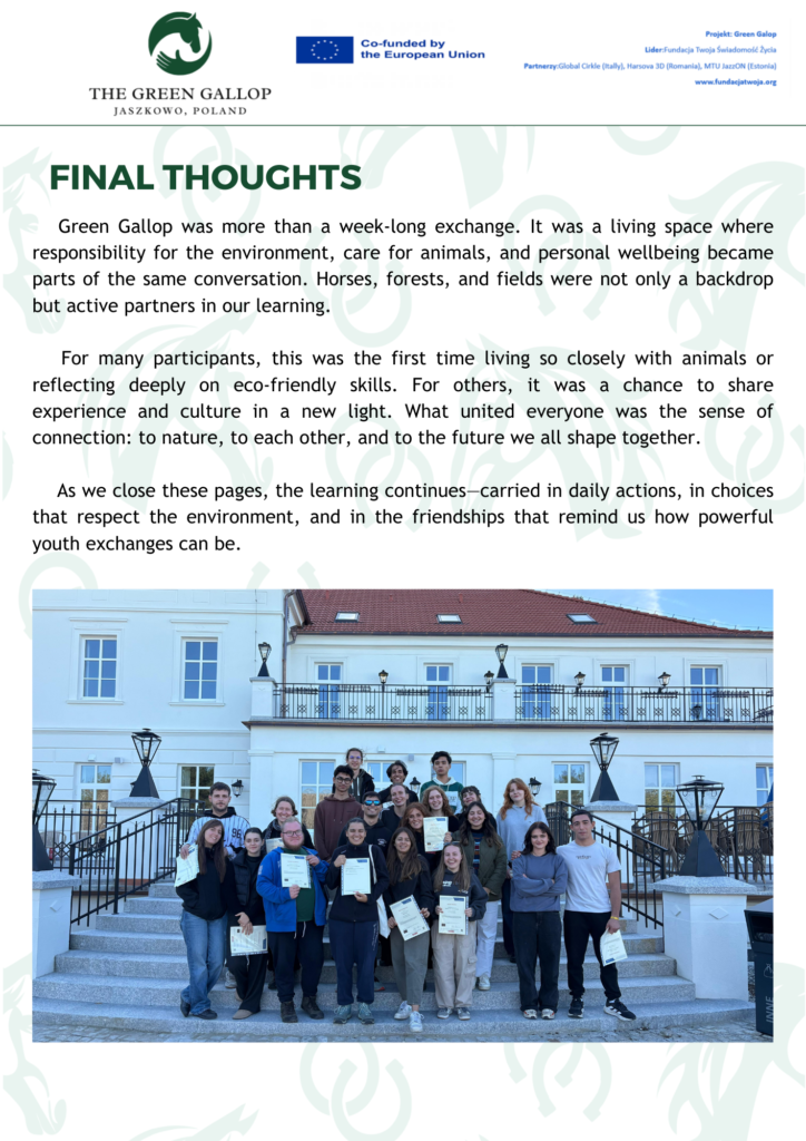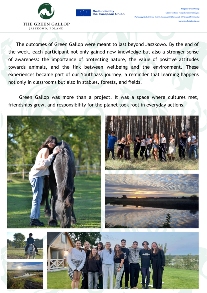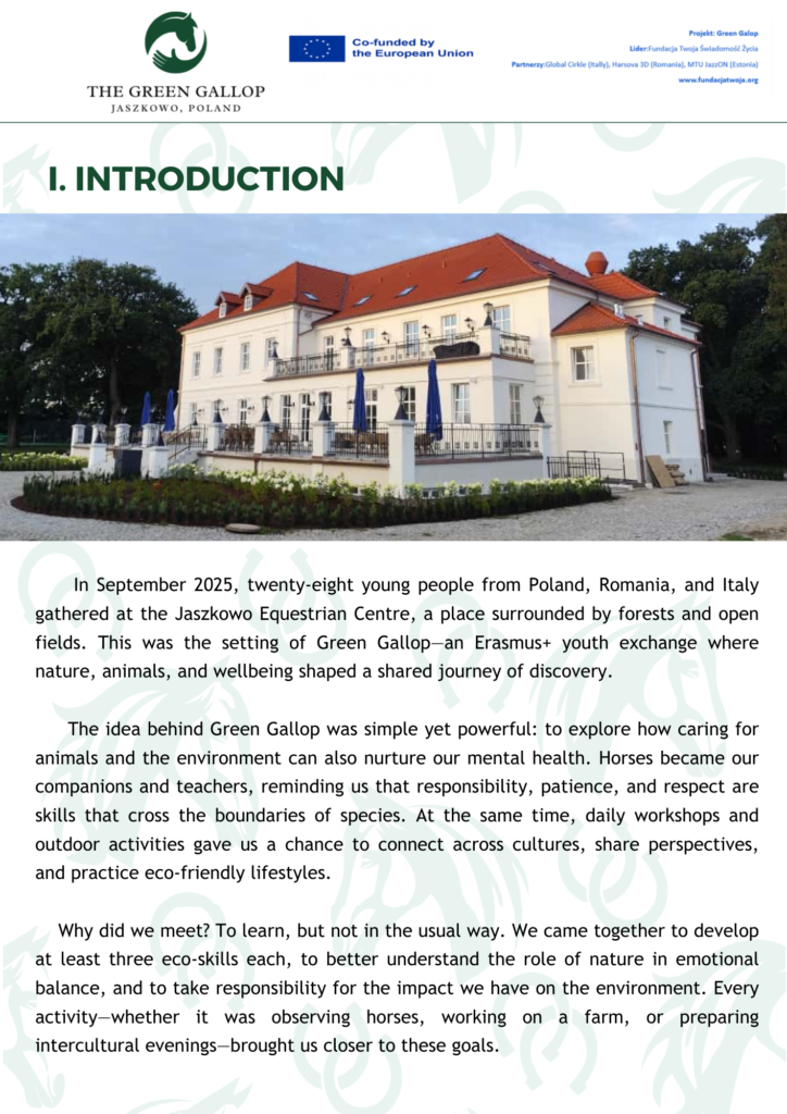 GREEN GALLOP BROCHUREang Broszura To efekt pracy uczestników projektu Green Gallop Jaszkowo 2025, który odbył się w dniach 18-24 wrzesnia 2025 w Centrum Hipiki Jaszkowo